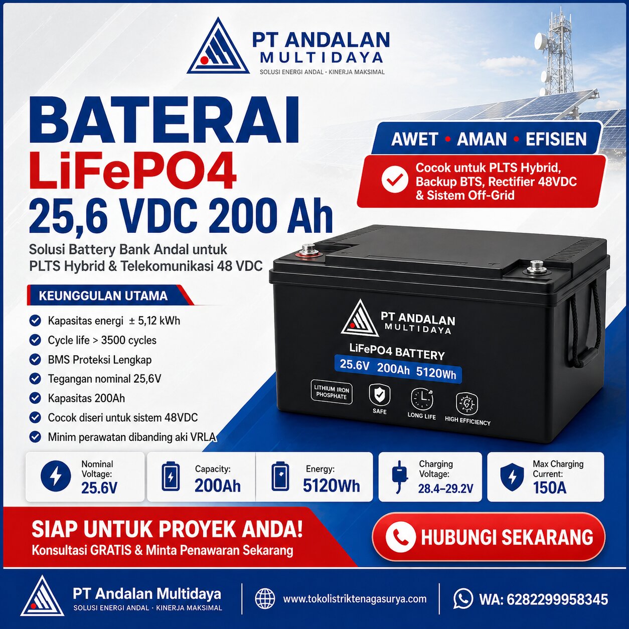 Baterai Lifepo4 25,6 vdc 200 ah adalah solusi penyimpanan energi modern untuk kebutuhan PLTS hybrid, sistem backup BTS, rectifier 48VDC, inverter hybrid, hingga sistem off-grid yang membutuhkan baterai stabil, aman, dan tahan siklus harian. Dengan kapasitas 25.6V × 200Ah, baterai ini memiliki energi total sekitar 5120Wh atau 5.12 kWh, sehingga cocok untuk menyimpan energi dari panel surya dan menyuplai beban saat malam hari atau ketika listrik utama padam.