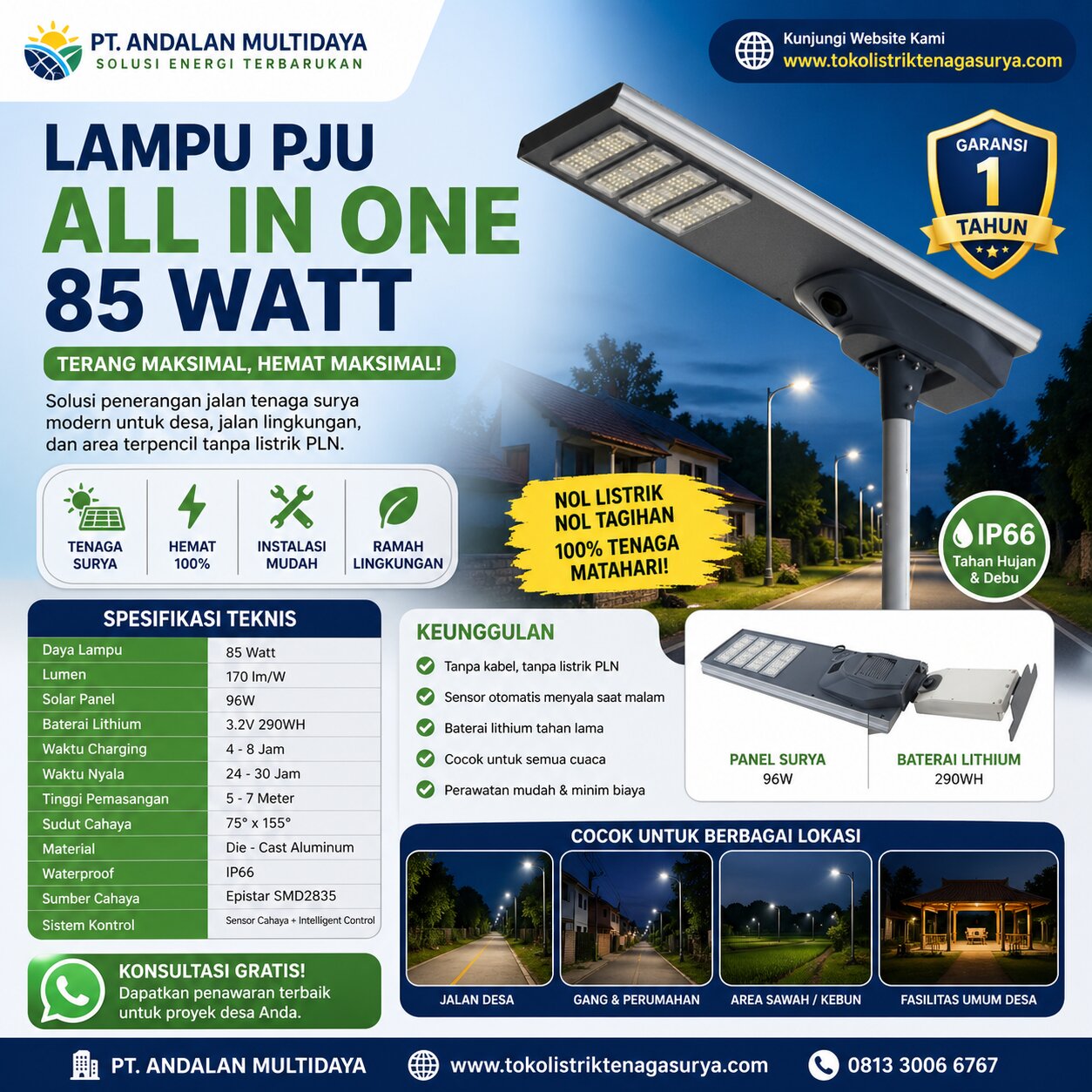 Lampu PJU All in One 85 watt adalah solusi penerangan jalan tenaga surya yang praktis dan hemat untuk kebutuhan desa. Menggabungkan panel surya, baterai lithium, dan lampu LED dalam satu unit, sistem ini mampu bekerja otomatis tanpa listrik PLN. Dengan efisiensi tinggi hingga 170 lm/W dan baterai 290Wh, lampu dapat menyala hingga 24–30 jam, bahkan saat cuaca mendung.